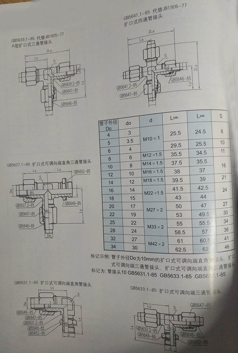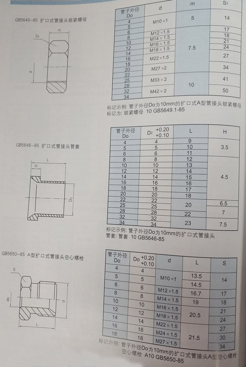 擴口式管接頭適用介質:油、水、氣等非腐蝕性或腐蝕性介質管接頭(其中具有代表性的制造商有上海通陽管件有限公司),配用鋼管的規格要求比較靈活,與管道焊接后,具有連接牢靠、密封性能好等特點,因而在煉油、化工、輕工、紡織、國防、冶金、航空、船舶等系統中被廣泛采用;也適用于各種機械工程、機床設備等液壓傳動管路。 擴口式管接頭制造標準